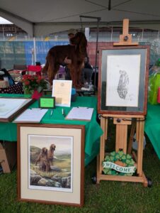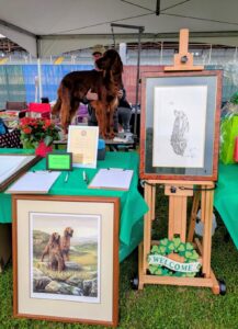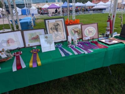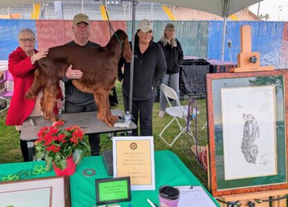 Trophies at this specialty were donated from the estates of Shirley Farrington—Shawnee Irish Setters, and Sue Mertens—Heartsong Irish Setters, both much acclaimed in the Irish Setter fancy and deeply missed by their fellow fanciers.
